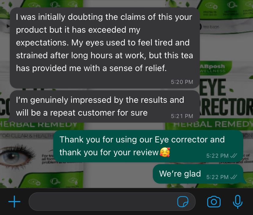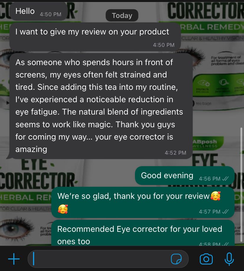 i’ve tried various products in the past but nothing compare to the Herbal Eye Corrector Remedy. it’s like a breath of fresh air for my eyes. i’ve noticed a significant reduction in dryness and irritation, and my night vision has improved remarkably. I love how it’s easy to incorporate into my daily routine, and the results speak for themselves. Thank you for creating such an incredible solution!”